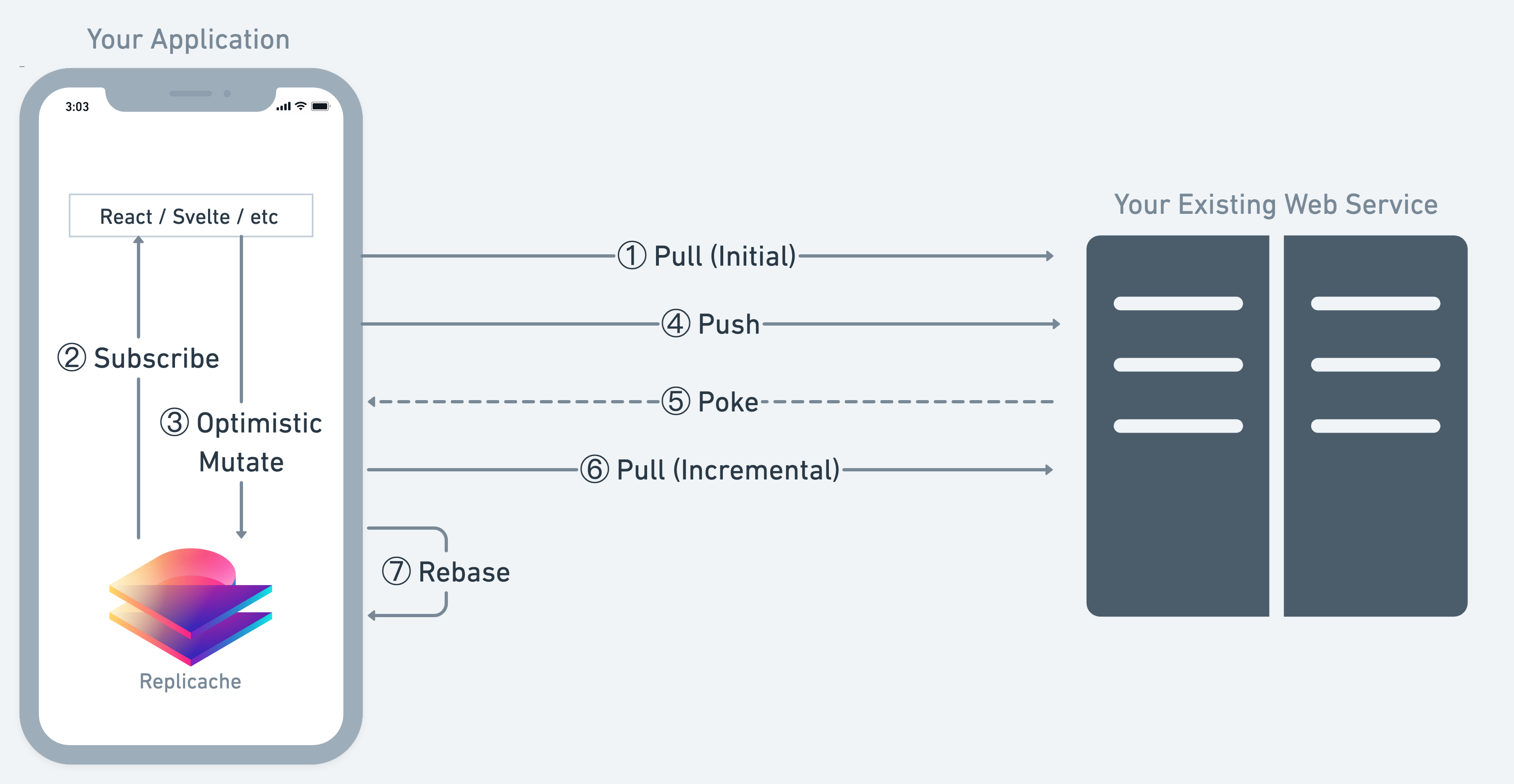 However, to use Replicache well, it is important to understand how sync works conceptually. And you need to know this if you plan to modify the server, use Replicache with your own existing backend, or swap out the datastore.